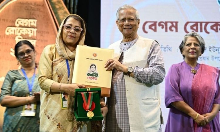 আজ ঢাকার ওসমানী স্মৃতি মিলনায়তনে আয়োজিত অনুষ্ঠানে রোকেয়া দিবস উপলক্ষে অন্তর্বর্তী সরকারের প্রধান উপদেষ্টা অধ্যাপক মুহাম্মদ ইউনূস পুরস্কারপ্রাপ্তদের হাতে পদক তুলে দেন।