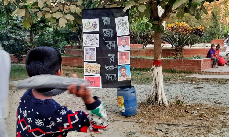 বিজয় দিবস উপলক্ষে একাত্তরের ঘাতক, রাজাকার ও আল-বদরদের ছবি সংবলিত প্রতীকী ঘৃণাস্তম্ভে জুতা নিক্ষেপ কর্মসূচি পালন করেছে জাতীয় কবি কাজী নজরুল ইসলাম বিশ্ববিদ্যালয়ের শিক্ষার্থীরা।