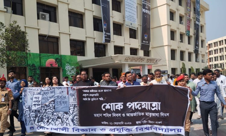 যথাযোগ্য মর্যাদায় নোয়াখালী বিজ্ঞান ও প্রযুক্তি বিশ্ববিদ্যালয়ে (নোবিপ্রবি) মহান শহিদ দিবস ও আন্তর্জাতিক মাতৃভাষা দিবস পালিত হয়েছে। এই উপলক্ষে শনিবার (২১ ফেব্রুয়ারি ২০২৬) শোক পদযাত্রা, সশস্ত্র সালাম প্রদান, কেন্দ্রীয় শহিদ মিনারে শ্রদ্ধা নিবেদন, আলোচনা সভা, দোয়া ও কালো ব্যাজ ধারণ কর্মসূচি অনুষ্ঠিত হয়।