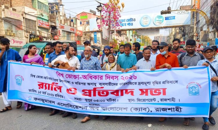 রবিবার বিকেল ৩টায় নগরীর সাহেববাজার জিরোপয়েন্টে কনজুমারস অ্যাসোসিয়েশন অব বাংলাদেশ (ক্যাব), রাজশাহী জেলা কমিটি বিশ্ব ভোক্তা-অধিকার দিবস ২০২৬ উপলক্ষে এই কর্মসূচির আয়োজন করে। প্রতিবাদ সভা শেষে একটি র‍্যালি নগরীর বিভিন্ন সড়ক প্রদক্ষিণ করে।