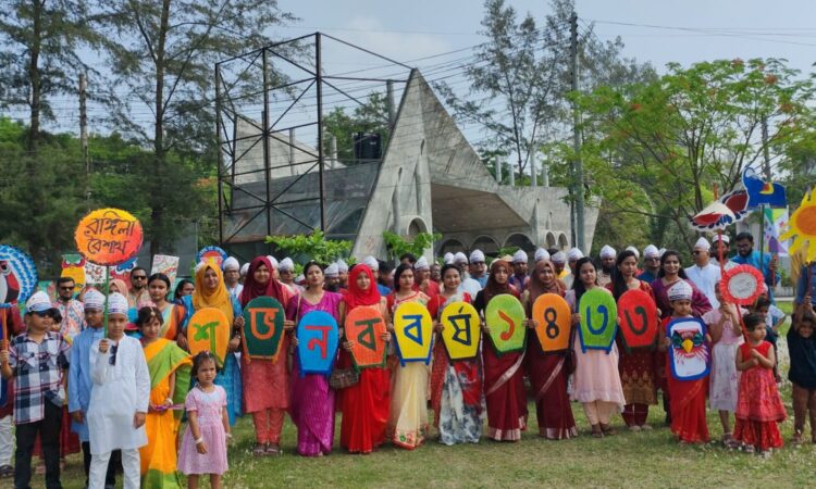মঙ্গলবার (১৪ এপ্রিল) সকাল ৯টায় বিশ্ববিদ্যালয়ের একাডেমিক ভবনের সামনে থেকে এক বর্ণাঢ্য বৈশাখী শোভাযাত্রার মাধ্যমে অনুষ্ঠানের আনুষ্ঠানিক উদ্বোধন করা হয়। শোভাযাত্রাটি ক্যাম্পাসের প্রধান সড়কগুলো প্রদক্ষিণ করে কেন্দ্রীয় মাঠে এসে শেষ হয়। শোভাযাত্রায় ছিল গ্রামীণ ঐতিহ্যের প্রতীকী উপস্থাপন, মুখোশ, ব্যানার, ফেস্টুন এবং নানা বর্ণিল সাজসজ্জা, যা পুরো পরিবেশকে করে তোলে প্রাণবন্ত ও আকর্ষণীয়।