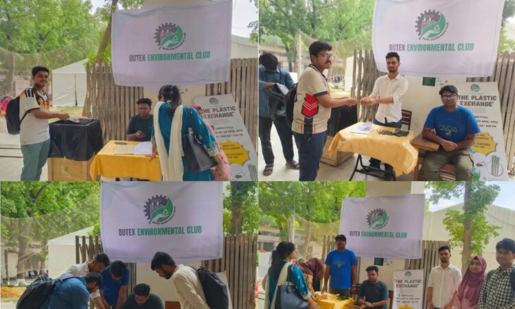 বিশ্ব ধরিত্রী দিবস (২২ এপ্রিল) উপলক্ষে বাংলাদেশ টেক্সটাইল বিশ্ববিদ্যালয়ে (বুটেক্স) অনুষ্ঠিত হয়েছে পরিবেশ সচেতনতা বৃদ্ধির এক ব্যতিক্রমী আয়োজন-‘দ্য প্লাস্টিক এক্সচেঞ্জ’। বুধবার সকাল ১১টা থেকে দুপুর ২টা পর্যন্ত ক্যাম্পাসের গ্রাউন্ড ফ্লোরে বুটেক্স এনভায়রনমেন্টাল ক্লাবের উদ্যোগে আয়োজিত এই কর্মসূচিতে ছিল শিক্ষার্থীদের ব্যাপক অংশগ্রহণ। ব্যবহৃত যেকোনো দুটি প্লাস্টিক বর্জ্য জমা দিলেই তাদের দেওয়া হয়েছে একটি ‘প্ল্যান্টেবল ইকো-পেন’ বা পরিবেশবান্ধব কলম, যা ব্যবহার শেষে মাটিতে পুঁতে দিলে সেখান থেকে গাছ জন্মায়।