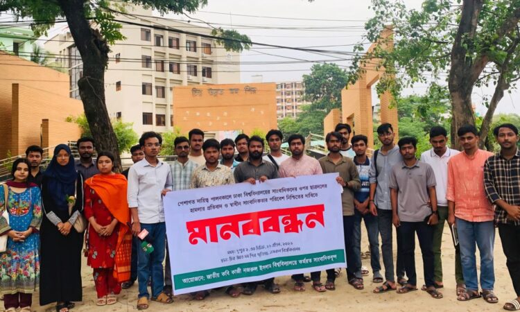 রবিবার (২৫ এপ্রিল) বিকালে বিশ্ববিদ্যালয়ের চির উন্নত মম শির স্মৃতিস্তম্ভের সামনে এই মানববন্ধন অনুষ্ঠিত হয়। এসময় হামলাকারীদের দৃষ্টান্তমূলক শাস্তি, গণমাধ্যমকর্মীদের নিরাপত্তা এবং স্বাধীন সাংবাদিকতার পরিবেশ নিশ্চিতের দাবি জানান তারা।